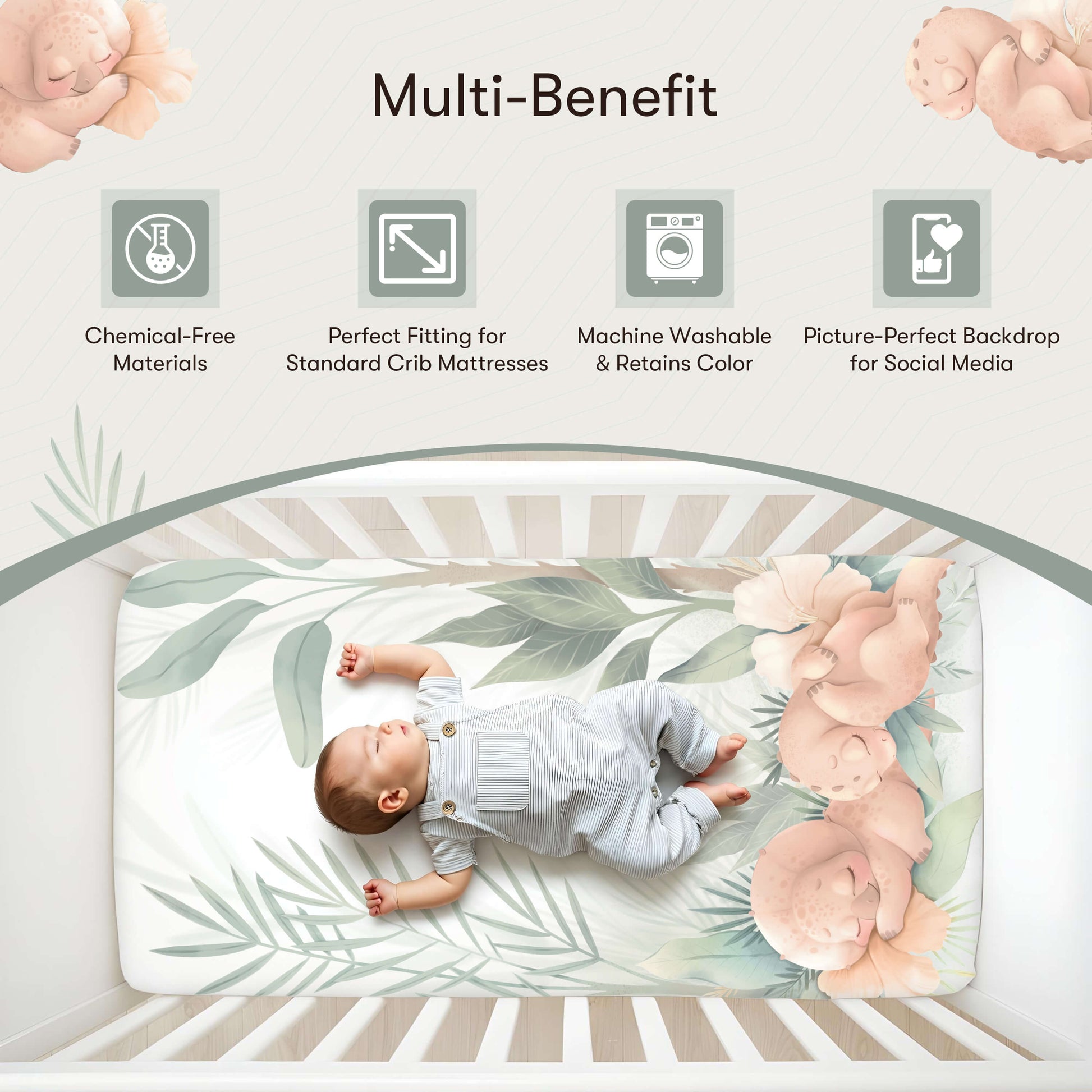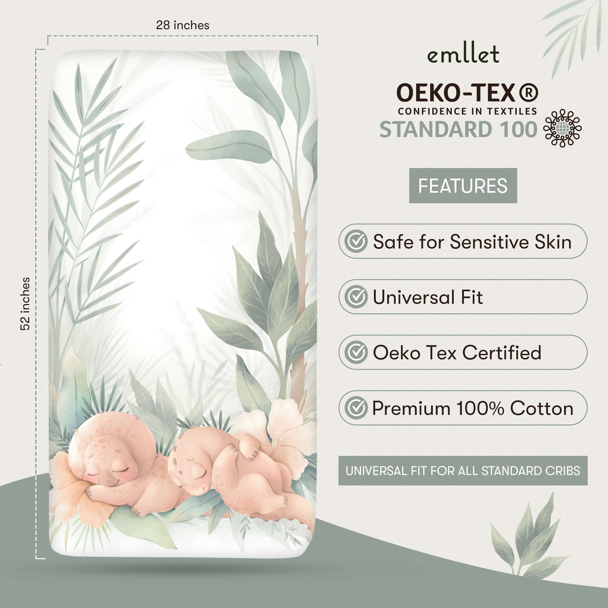 Dino Discovery crib sheet invites your little explorer to a land of gentle dinosaurs and prehistoric fun. Crafted from 100% OEKO-TEX certified cotton, it's soft, breathable and safe for delicate skin. A fully elasticized edge ensures a snug fit on standard crib and toddler mattresses. Machine washable and durable, the vibrant print stays bright wash after wash. Add a touch of adventure to your nursery and nurture sweet dreams.